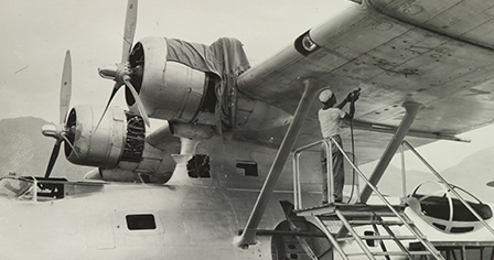 At that time there were still seaplanes in the airport, like the “Sunderland” seaplane of the British Overseas Airways Corporation. It was special work for us to do seaplanes, because we had to ride a boat. There were four engines on a seaplane, hung down by the hanging ladders. Our tools often dropped into the water. We were fun-seeking youngsters at that time, and we dropped the tools so we could dive in to pick them up.