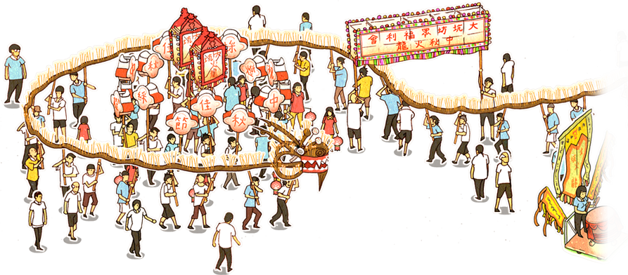 村民依计行事,由于爆竹含有硫磺火药,加上香火薰烟,瘟疫果然消除。自此大坑每年中秋节都有舞火龙,祈求合境平安,至今已有百多年历史。