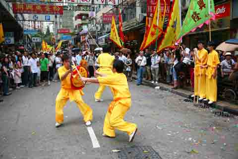 每有神诞巡游,便是武术或舞狮团体表演的机会。他们派出醒狮、麒麟、金龙等瑞兽前来助庆,一方面祈求神明保佑,另一方面向地区和其他团体展示实力,犹如一场武林大会,可以看到各门各派的武艺聚首一堂,观摩切磋。