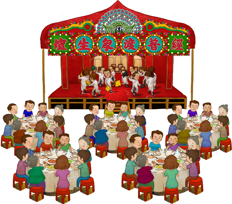 第三天晚上,主辦機構在場地設宴,大家聚首一堂。期間競投福物(洋酒飾物),價高者得,以彌補盂蘭勝會的開支。最後佛社居士進行一場「走散旗」儀式,在「金童」和「玉女」帶領下,持著令旗在台上左穿右插,向神靈通報此場法事功德圓滿。到深夜,則火化神靈的坐騎和神袍。