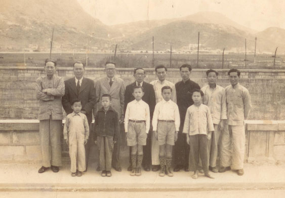 相中後排不少是衙前圍的話事人,包括海員工會主席吳渭池(左四)、淪陷後期的衙前圍鄉長吳潤初(左一)、後來的村代表吳發仔(右三)、李富父親李錦全(左三)。攝於1948年的啟德明渠。 - 李富提供