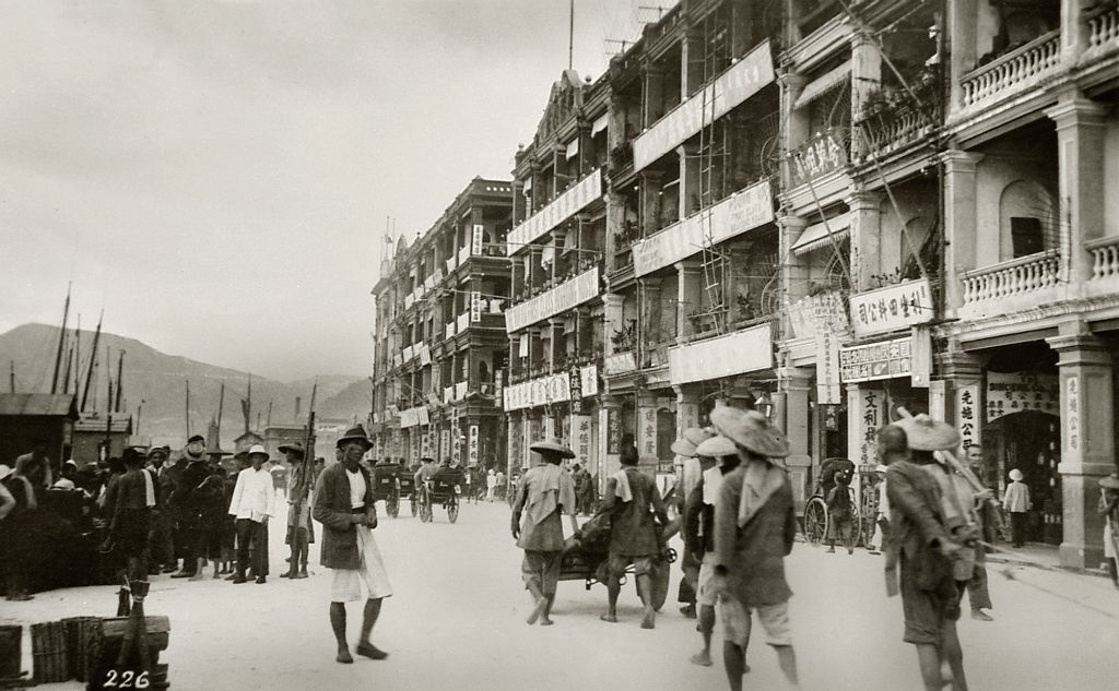 约1920年的上环干诺道中海旁。除商店外,附近一带还开设了不少旅店,为往返香港的商旅提供住宿;右端可见先施公司。